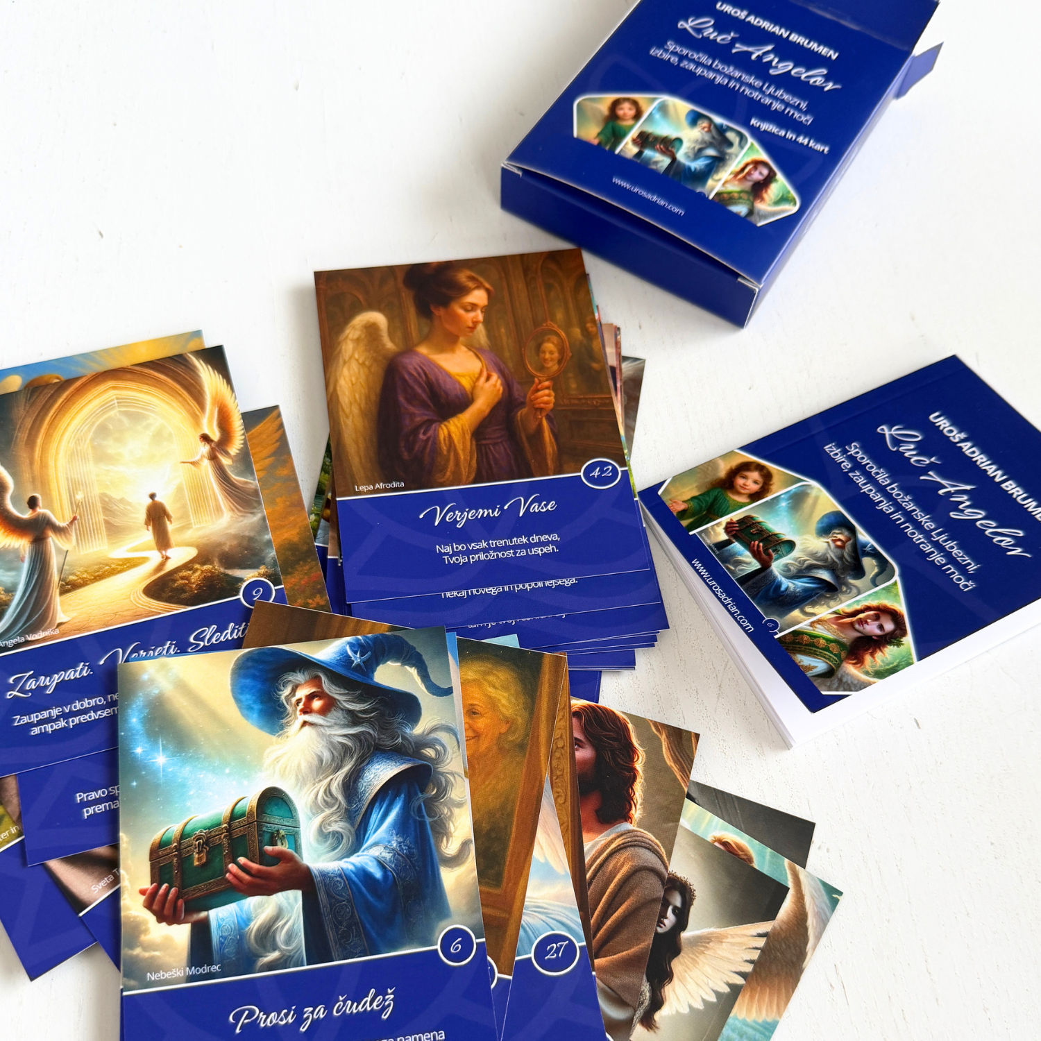Pred teboj je edinstven komplet 44 Angelskih kart, ki nosijo čista sporočila božanske Ljubezni, zavestne izbire, globokega zaupanja in notranje moči.